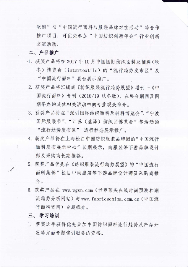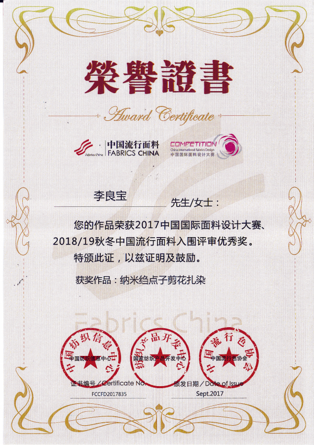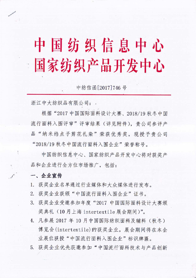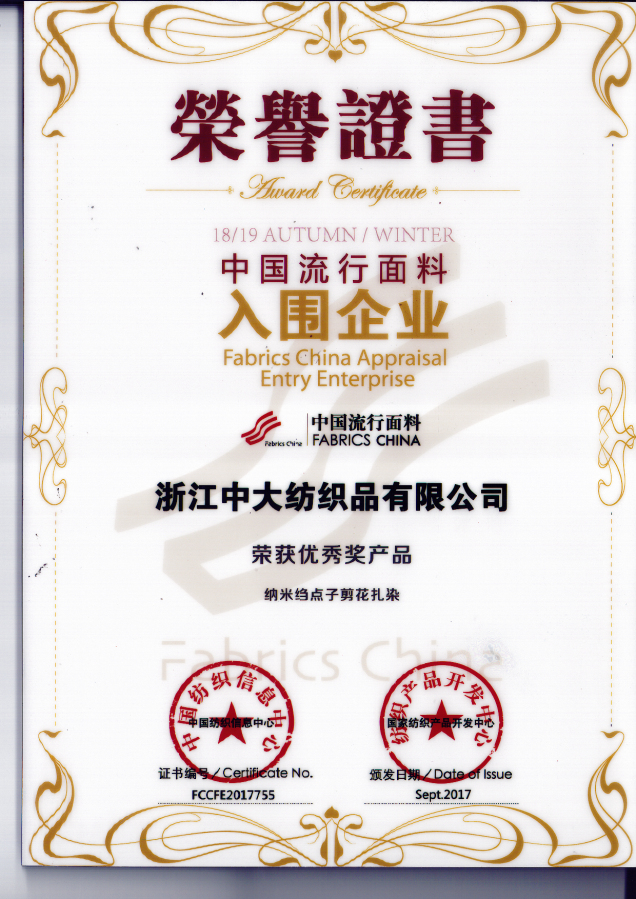 近日,公司收到中國(guó)紡織信息中心、國(guó)家紡織產(chǎn)品開(kāi)發(fā)中心中紡信函[2017]746號(hào)文,根據(jù)“2017中國(guó)國(guó)際面料設(shè)計(jì)大賽,2018/19秋冬中國(guó)流行面料入圍評(píng)審”評(píng)審結(jié)果,我公司產(chǎn)品產(chǎn)品“納米縐點(diǎn)子剪花扎染”榮獲優(yōu)秀獎(jiǎng),授予我公司“2018/19秋冬中國(guó)流行面料入圍企業(yè)”榮譽(yù)稱號(hào)。