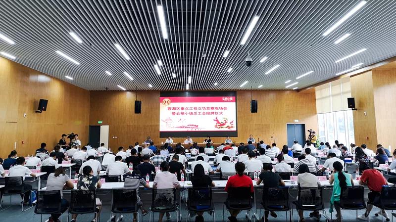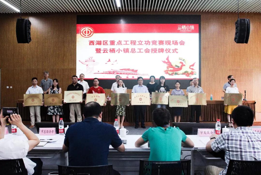 2018年9月3日下午,西湖區重點項目工程立功競賽暨云棲小鎮總工會授牌儀式在云棲小鎮2050廳圓滿落幕,中大銀座聯合工會作為云棲小鎮總工會下新設立的10個基層工會之一,接受了市人大常委會副主任、市總工會主席鄭榮勝授牌。